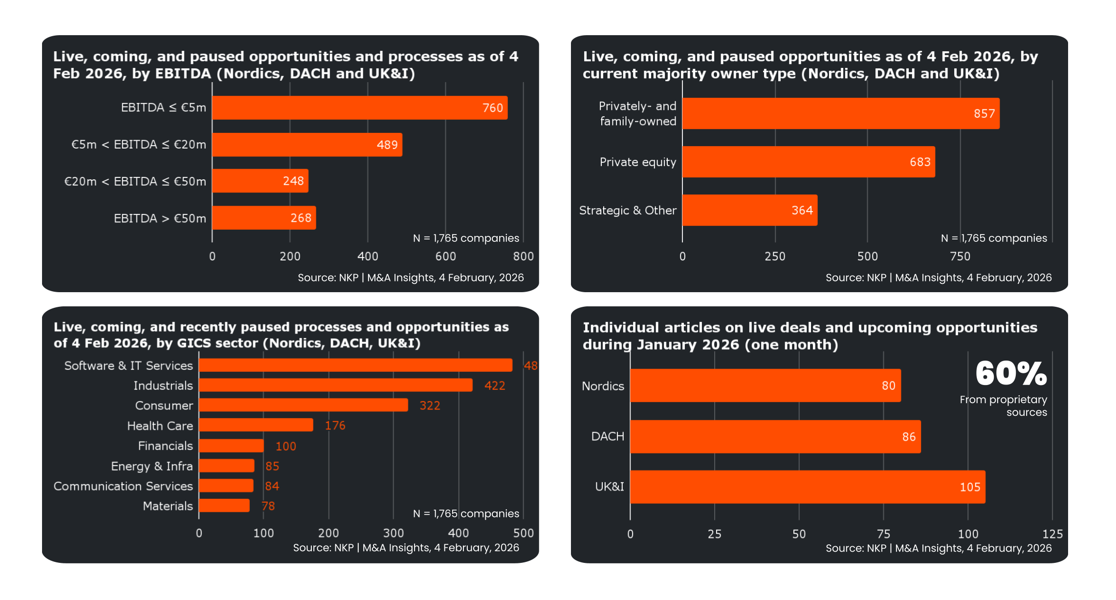 NKP | M&A Insights is a primary intelligence platform focused on non-public M&A processes across Northern Europe. Our coverage is built through a combination of bilateral primary sources (company owners, investors, and intermediaries), continuous monitoring of market signals, and internal verification and enrichment prior to publication. Many asset owners and their sell-side advisors work discreetly with NKP as we never disclose our sources, we're flexible in our framing, and our coverage tends to generate meaningful inbound interest - a low risk way to surface qualified buyers without having to approach them directly, thus preserving maximum optionality.