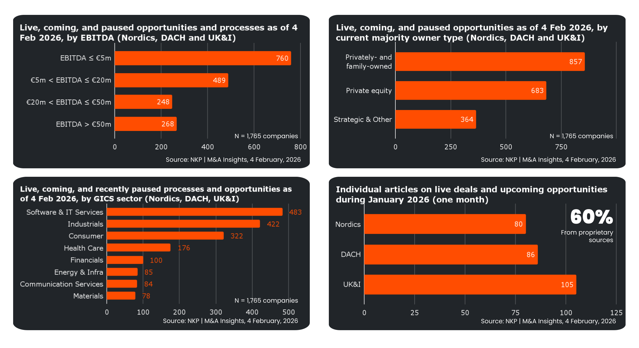 Explore a SubscriptionNKP | M&A Insights provides structured visibility into non-public and early-stage M&A processes across the Nordics, DACH and the UK & Ireland.